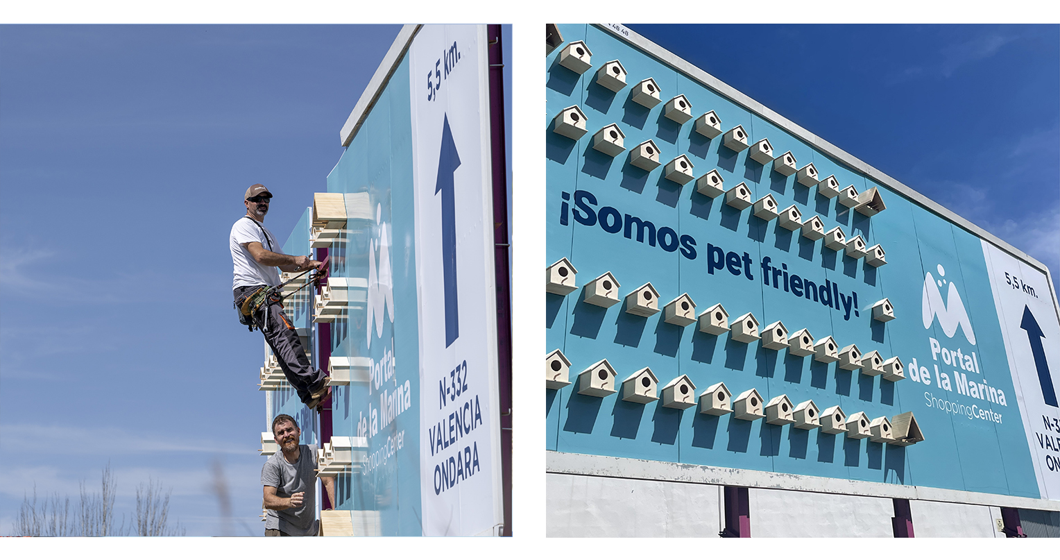 El Centro Comercial Portal de la Marina nos llamó y nos dijo: oye, que somos pet friendly. Al principio pensábamos que nos lo decían para avisarnos de que ya podíamos entrar nosotros, pero no, se referían a las mascotas y querían que lo comunicáramos. Y eso hicimos, pero haciendo más que diciendo. Creamos las vallas más pet friendly, con 80 casitas de madera para pájaros la mar de bonitas. Una campaña de exterior que llegó a las redes y que nos generó una notoriedad animal.
